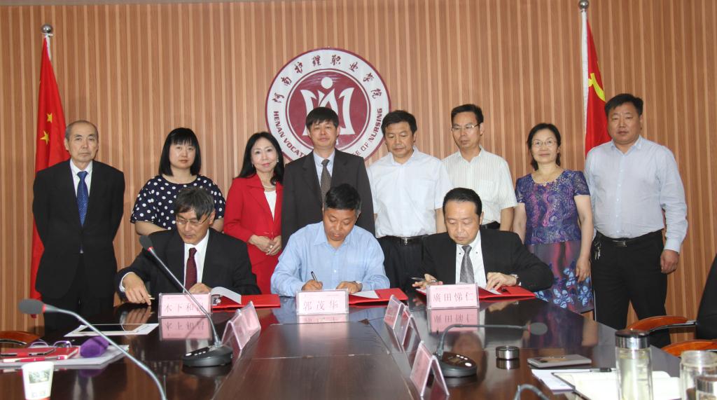 最后,双方在第二会议室举行了隆重的签约仪式,签约仪式由副院长钟会亮主持。我院院长郭茂华和日本国际医疗福祉人才育成机构(NPO)理事长廣田悌仁、神户国际语言学院理事长木下和昌三方共同签署了友好合作协议书并互赠了礼品。此次签约双方合作的项目主要内容是为我院涉外专业的学生提供日语培训,达到日语二级水平,即可赴日参加该机构全额奖学金的日语及日本护士资格考试的辅导课程,在通过日本的护士资格考试后,将留在该机构的合作医院从事护士工作。该项目今年全面开始启动。