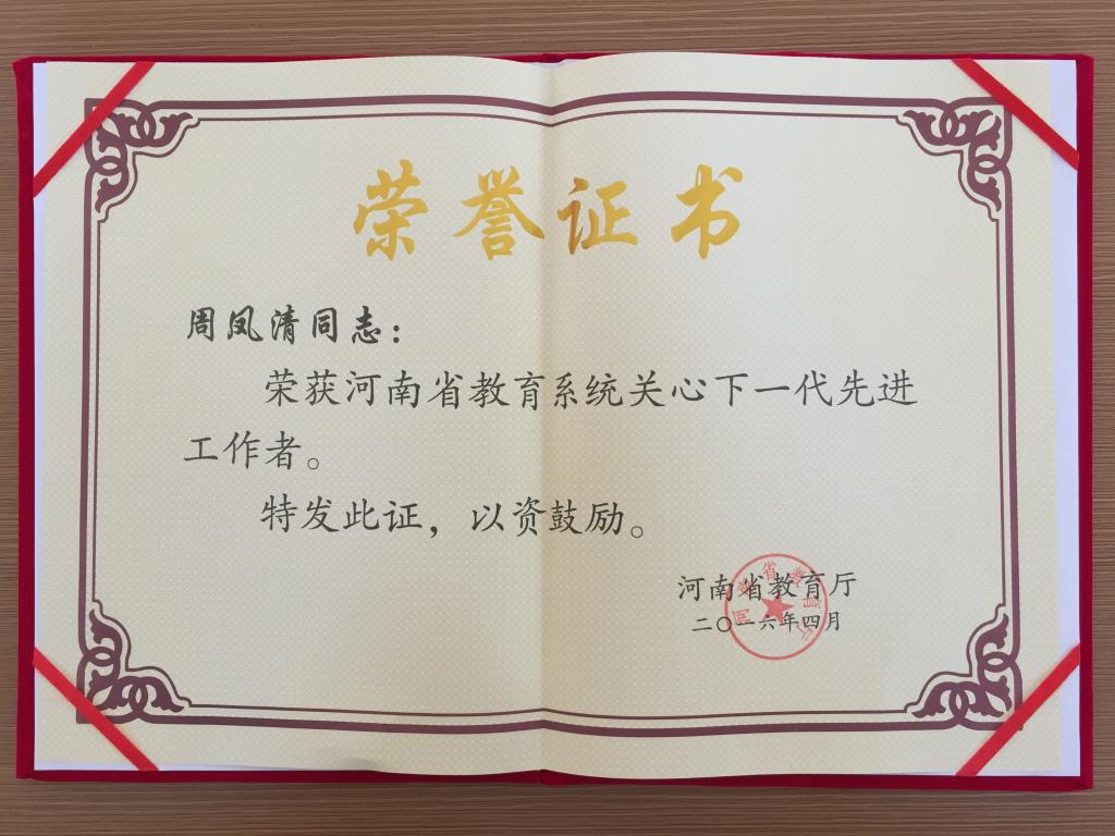 会议对近些年来在全省教育系统中涌现出的先进集体和先进个人进行了表彰,并对今年的关心下一代工作进行了安排部署。我院关工委工作在学院领导的正确领导和各部门的配合支持下,因事迹突出,被授予“河南省教育系统关心下一代工作先进集体”荣誉称号,我院退休老教师周凤清同志同时被评为“河南省教育系统关心下一代先进工作者”。