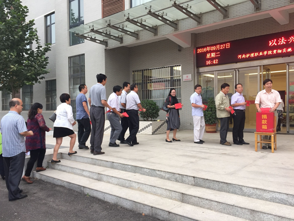 9月27日下午,我院在校医院北门举行“以法兴善•助力脱贫”——星空XK体育贯彻实施《中华人民共和国慈善法》暨首个“中华慈善日”捐款仪式。学院领导花明、郭茂华、钟会亮、张淑爱、王家桥及全体中层干部、教研室主任纷纷在活动现场献出自己的爱心。这是我院落实《关于印发安阳市实施<中华人民共和国慈善法>和开展首个“中华慈善日”活动实施方案的通知》文件要求的重要举措,在全院营造了浓厚的献爱心氛围。