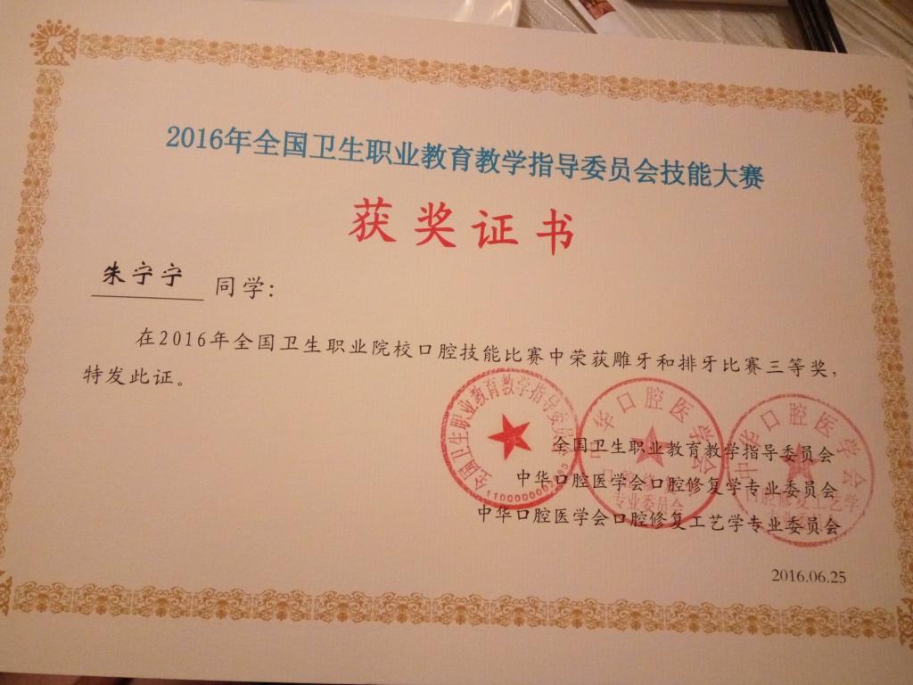 我院首次参加比赛,由指导教师孟琨带队,带领医学技术系口腔医学技术专业朱宁宁、王倩楠两位同学与来自全国70多所高校的205名优秀选手同台竞技,参赛中沉着冷静、克服困难、精心操作,在经过理论考试、牙齿雕刻、全口排牙等竞赛环节后,朱宁宁同学获得雕牙和排牙比赛三等奖。