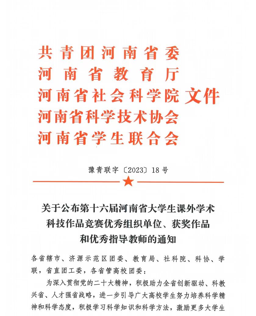 近日,喜讯传来,由共青团河南省委、河南省教育厅、河南省社会科学院、河南省科学技术协会、河南省学生联合会共同举办的第十六届“挑战杯”河南省大学生课外学术科技作品竞赛结果公布,星空在此次省级比赛中,共斩获二等奖2项、三等奖6项。