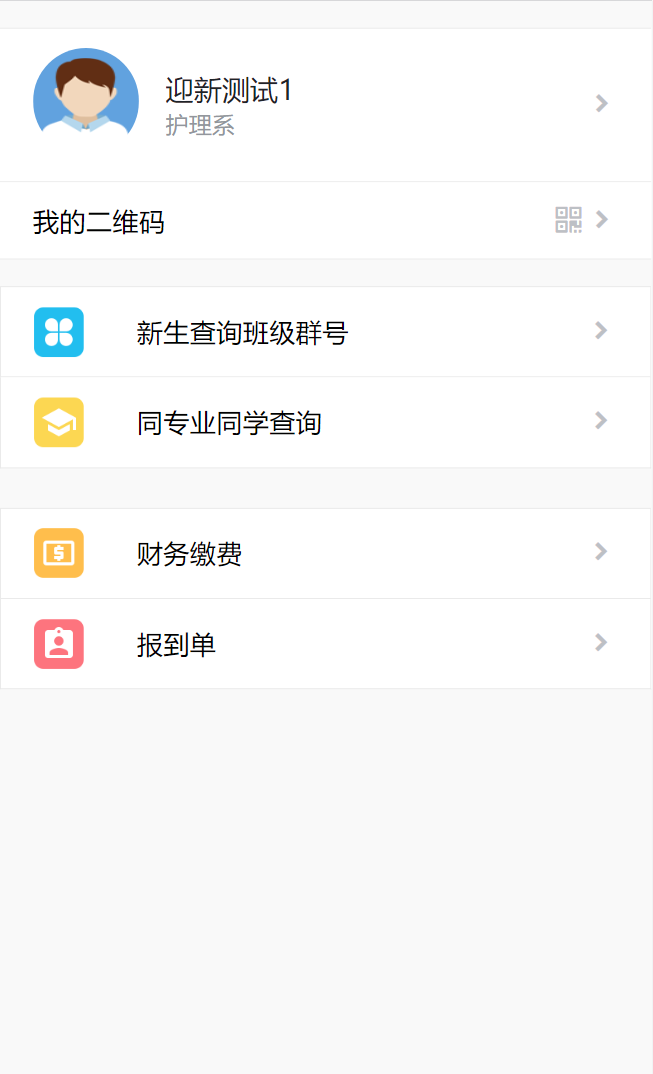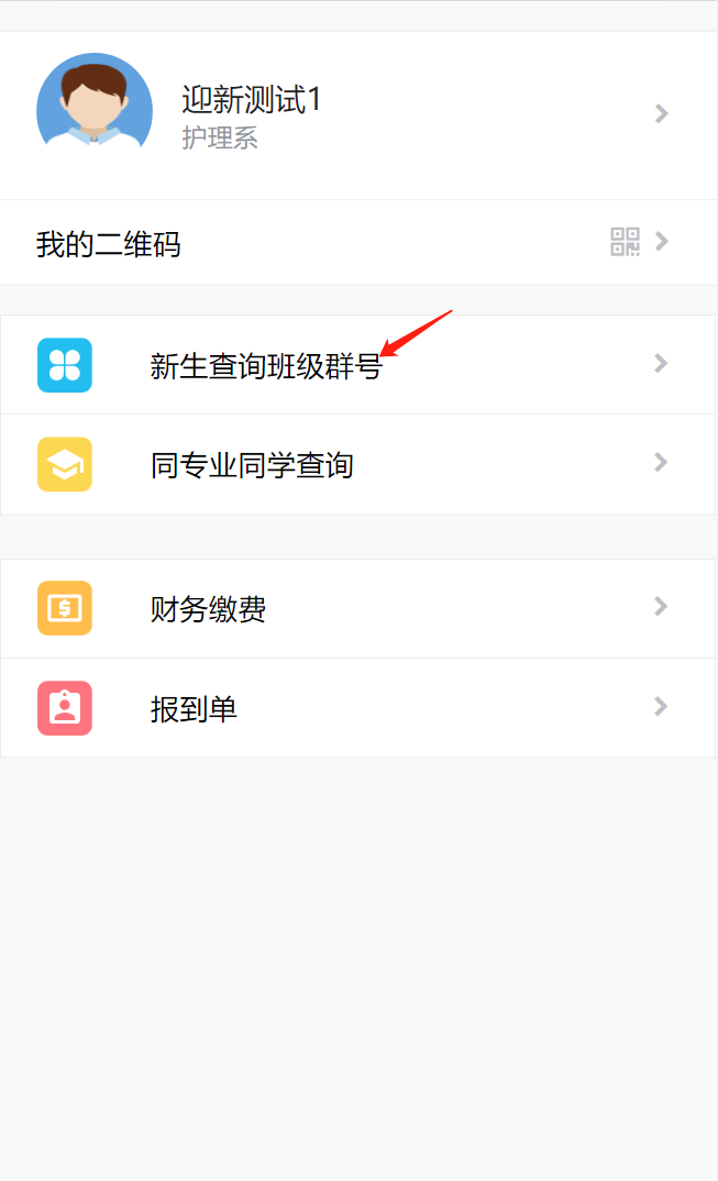 第五步:新生班级QQ群号及辅导员查询。点击“新生查询班级群号”,可查询到班级QQ群号、班级名称、辅导员信息(在分班完成后十分钟左右可以查看)。