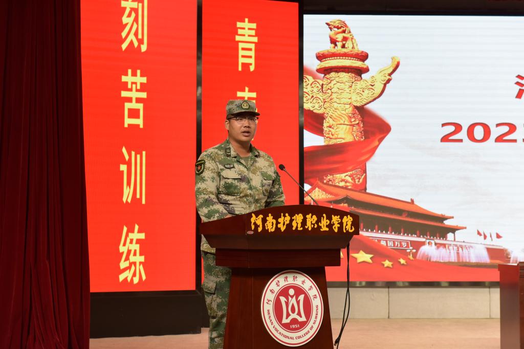 军训队教官代表发言,他表示将不辜负学校期望和信任,按纲施训,精心组织,尽职尽责完成训练任务。