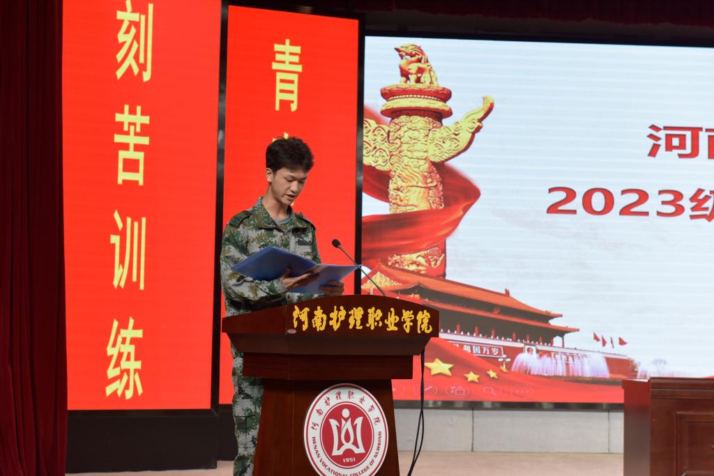 2023级新生代表李嘉豪发言,他向各位领导、老师和教官表达了最崇高敬意!并代表全体参训学生承诺:一切行动听指挥,服从命令,团结同学,刻苦训练,严于律己,争做军训标兵。