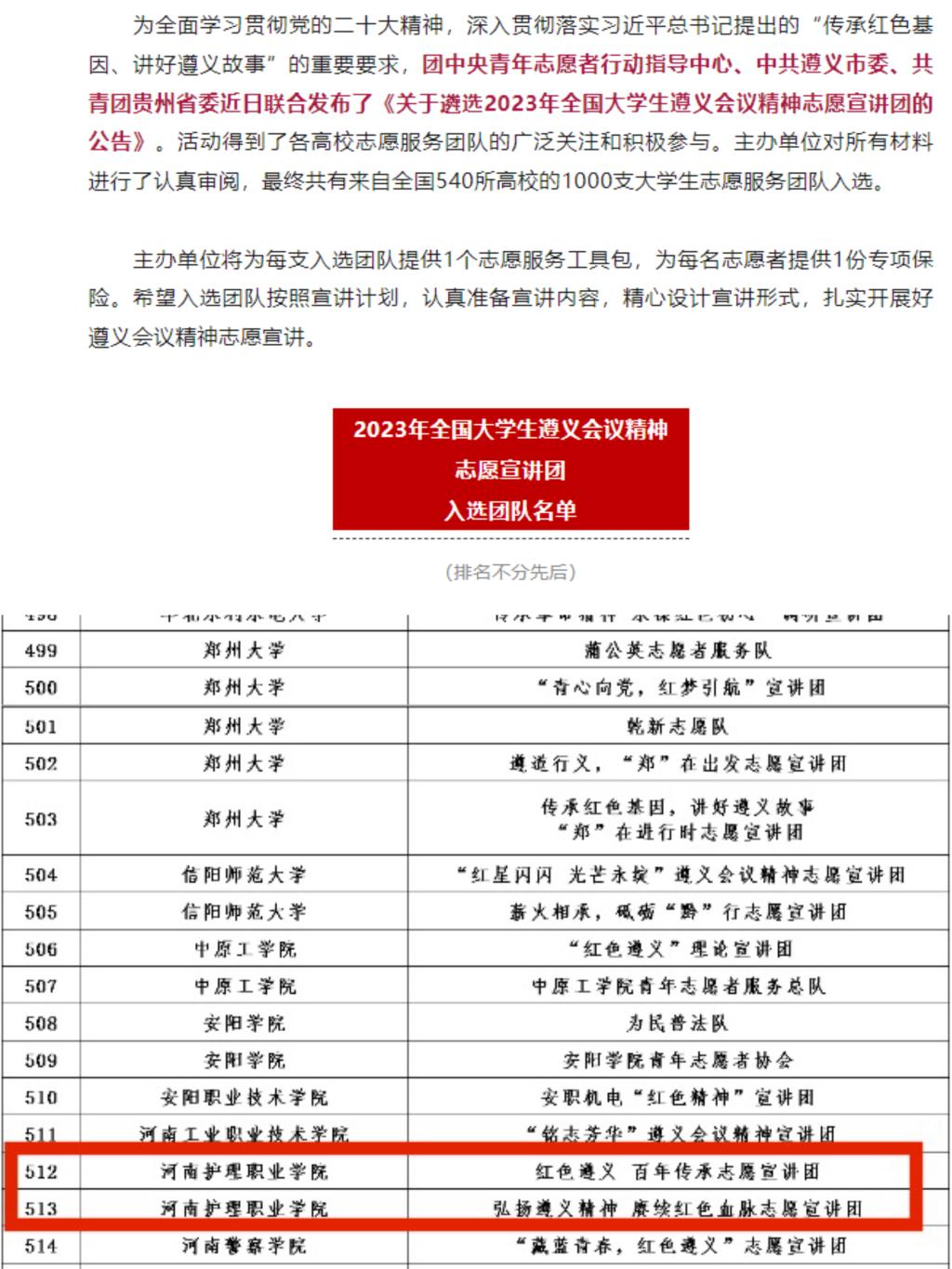 星空团委高度关注此项活动并动员各级团组织积极参与。最终,星空“红色遵义 百年传承”、“弘扬遵义精神 赓续红色血脉”两支大学生志愿宣讲团成功入选2023年全国大学生志愿宣讲团!