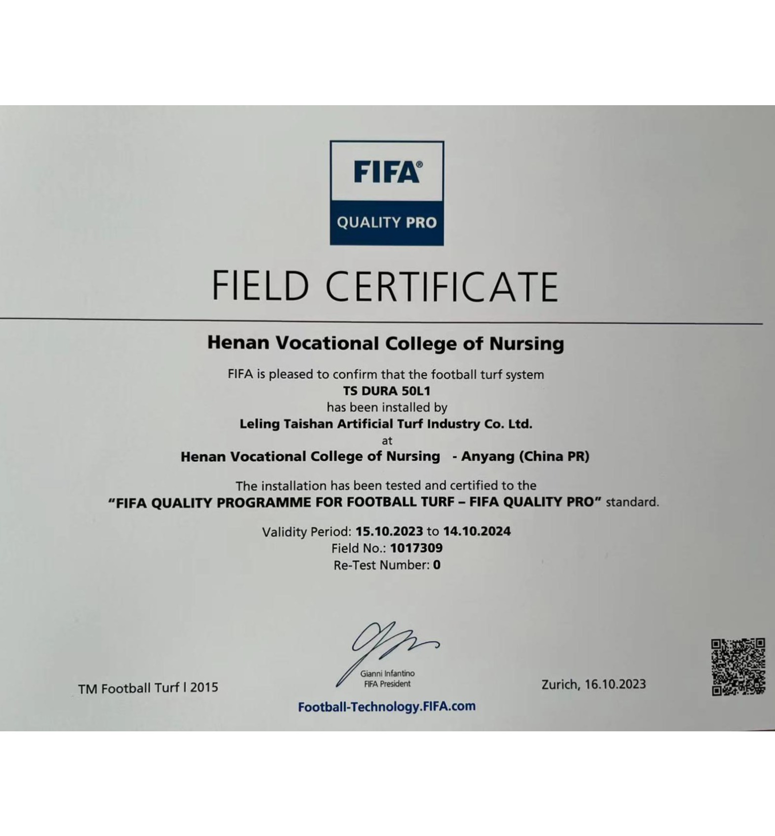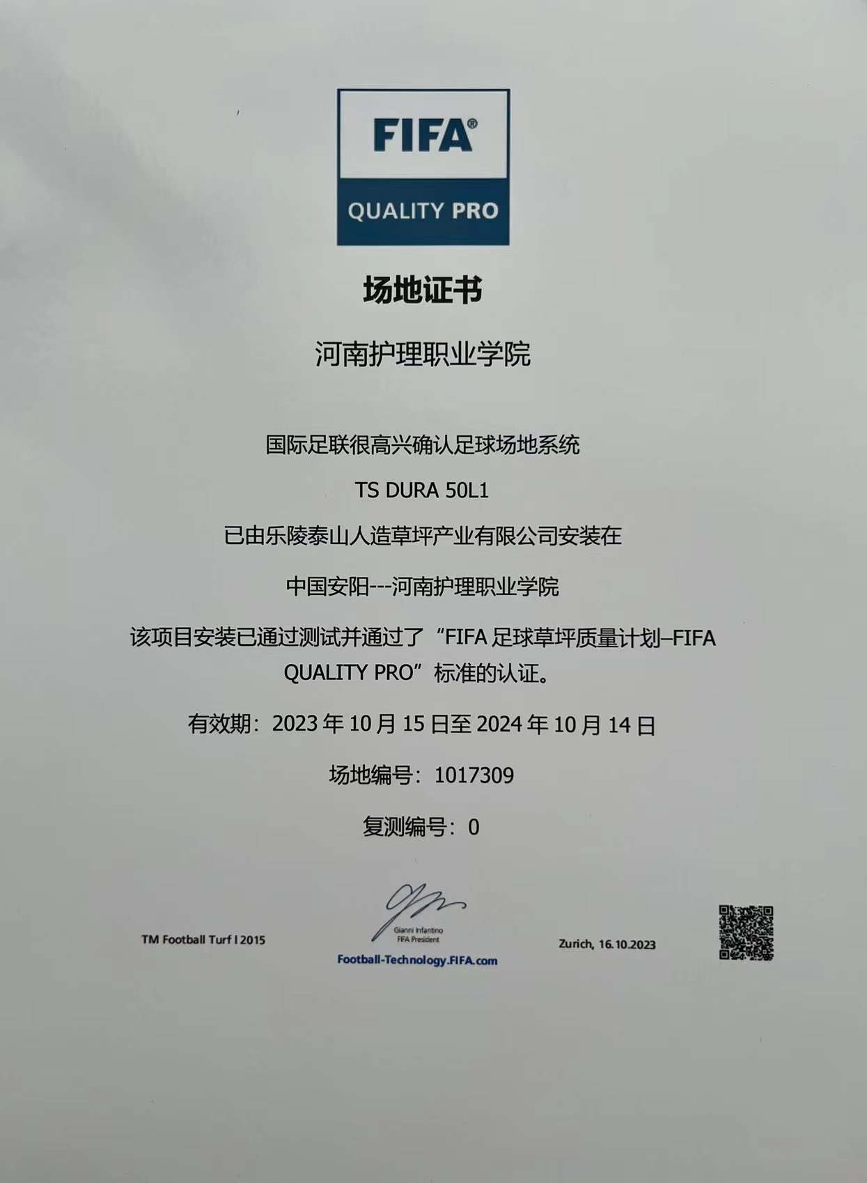 星空足球场翻新修缮项目自2023年8月开工建设以来,学校相关部门在专家论证、材料选用及施工监管等方面严格把关,先后克服了工期紧、标准高、现场施工难度大等困难,保证了足球场的质量和效果,并于2023年10月成功通过了国际足联的验收,被国际足联授予最高级别认证——FIFA QUALITY PRO认证。据悉,星空综合运动场足球场地是安阳市学校包括高校首块获得此项认证的足球场地。