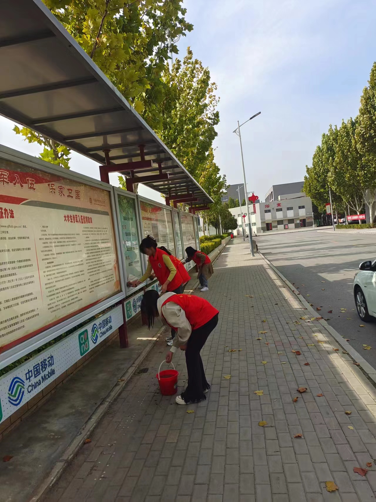 为共创美好校园,志愿者们在校园内清理落叶,仔细擦拭校园宣传板、公共体育器材、体育场看台、洗手池等公共设施,并协助校园爱心献血活动有序开展。