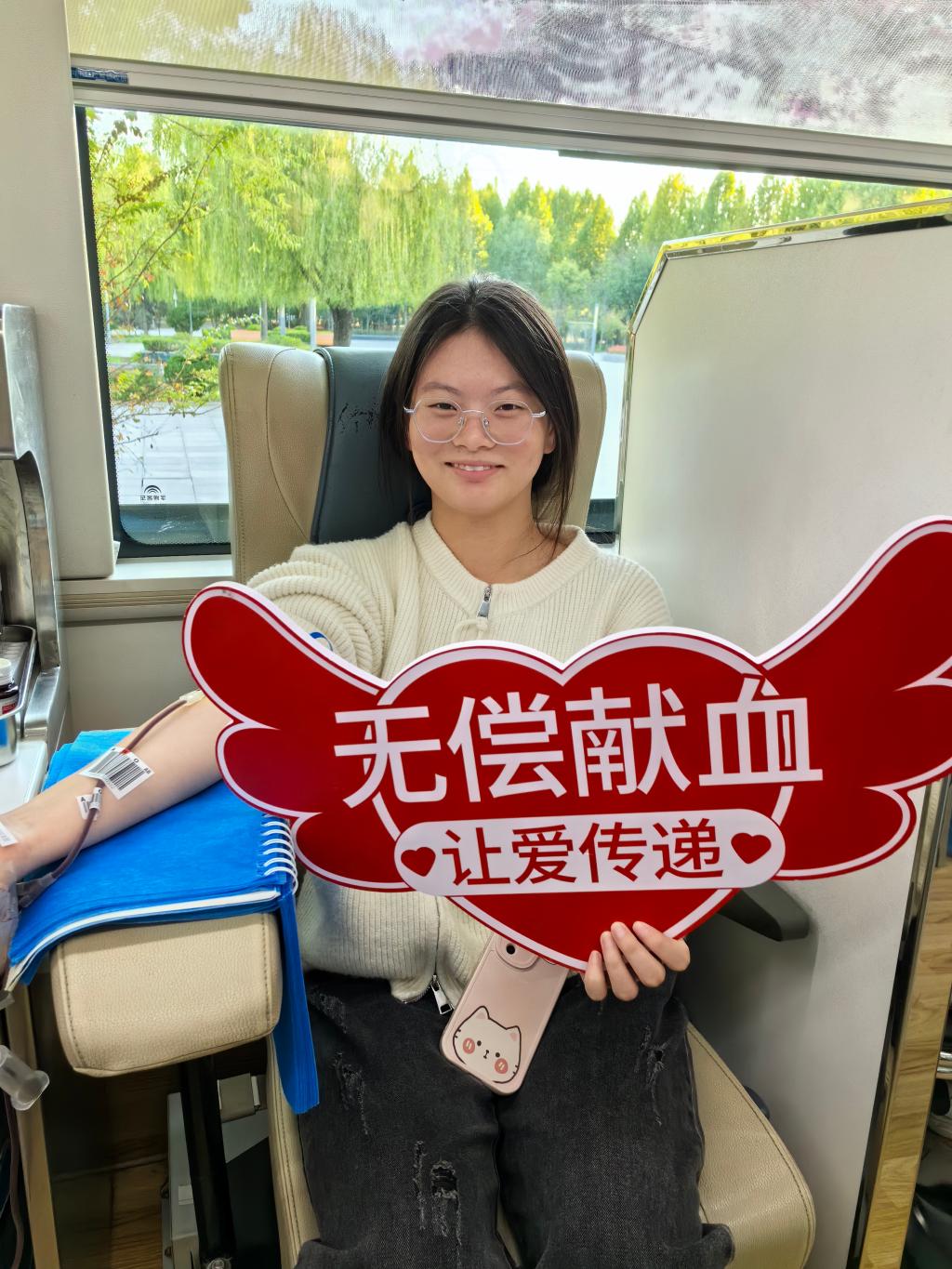 “我满心欢喜跑到献血现场,献血车上人满为患,河护师生化身‘热血勇士’,为他们的行为点赞。志愿者和血站工作人员热情的态度、暖心的服务感动满满,缓解了我内心的恐惧。送人玫瑰,手有余香。献血是一件很有意义的事情,希望能够帮助到需要的人。”23级急救护理2班学生孙文妍说。