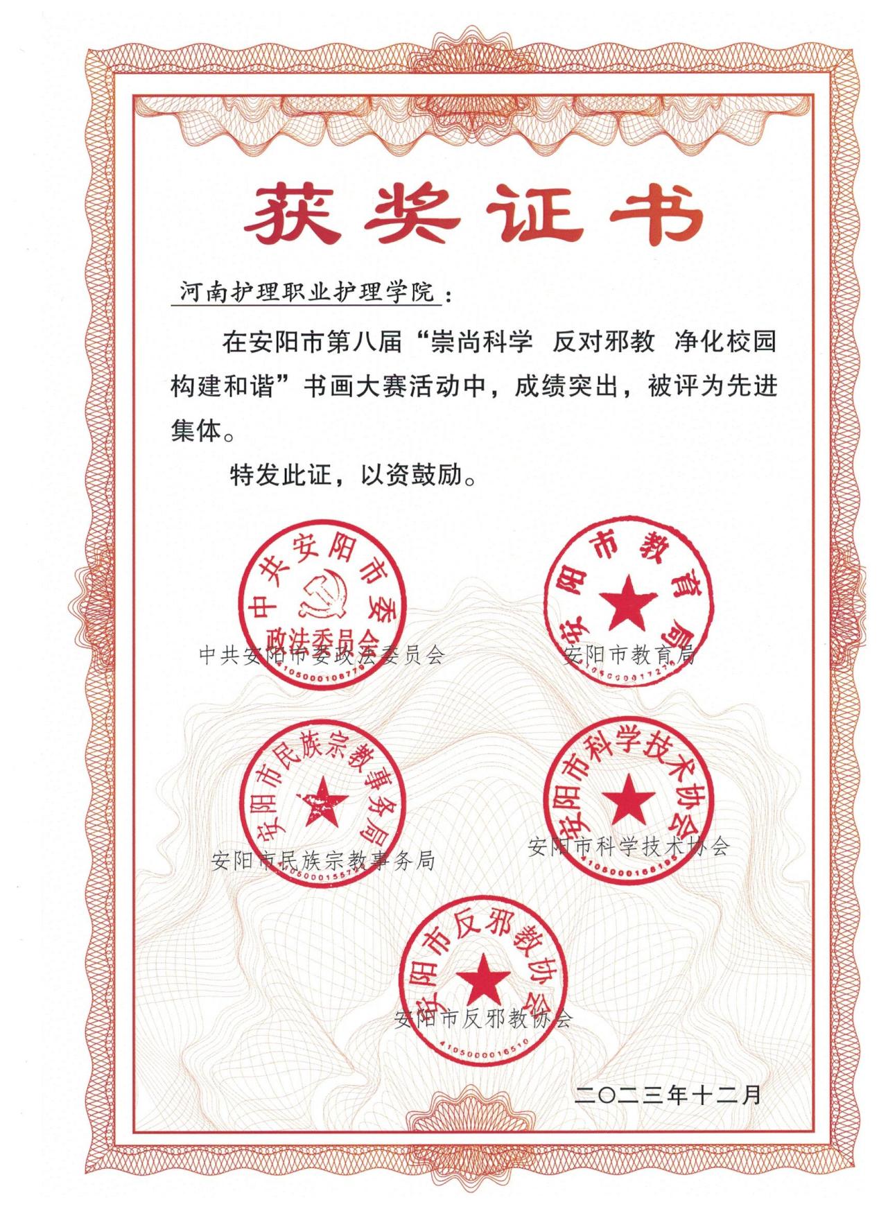 为深入贯彻落实习近平总书记关于反邪教工作重要指示精神,切实加强校园反邪教警示教育工作,进一步增强广大师生的识邪、防邪、拒邪、反邪的能力,星空积极组织师生参加安阳市第八届“崇尚科学、反对邪教、净化校园、构建和谐”书画大赛,荣获佳绩。