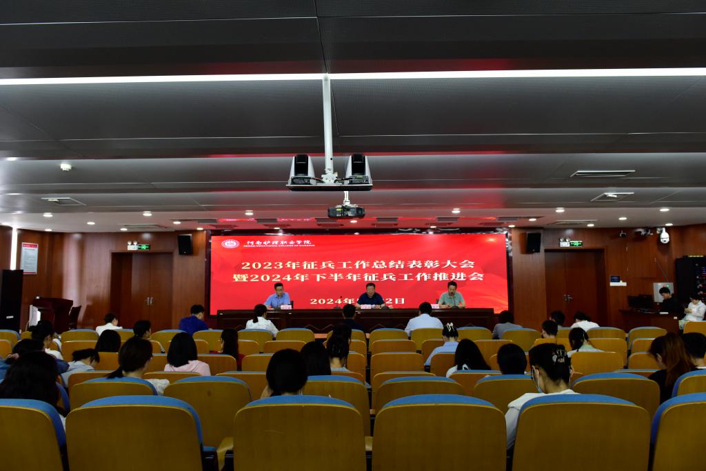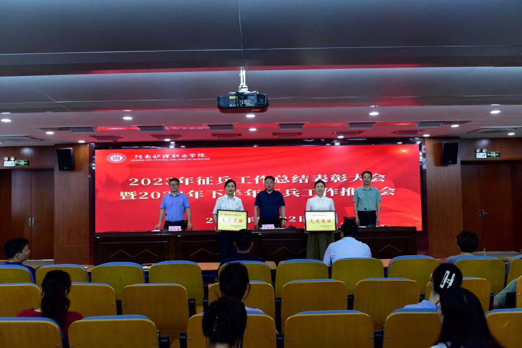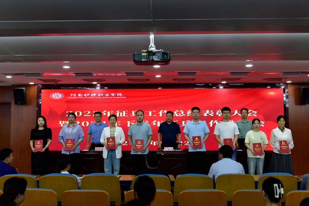 王新庄宣读了《星空XK体育关于表彰2023年度“征兵工作先进集体”“征兵工作先进个人”的决定》(豫护院党〔2024〕5号)文件;王家桥向荣获“征兵工作先进集体”的护理系和临床医学系颁发了奖牌,向荣获“征兵工作先进个人”的辅导员老师颁发了荣誉证书;赵志鑫宣读了2024年各系征兵任务,并就2023年度征兵工作中出现的突出问题进行了解答。
