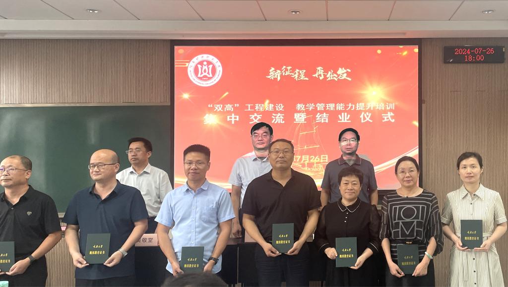 学校领导为学员代表颁发了结业证书。黄敬堂结合本次培训,就如何贯彻学校工作部署,围绕提高“三率”和“双高”工程建设,加强和改进教学工作做了安排。钟会亮指出,大家体会很深、启发很大、建议很好,真正做到了学思结合。同时,在具体实践中也要注意,推进工作,把握政策是前提;能力提升,平台建设是关键;立德树人,深化党建是保证。