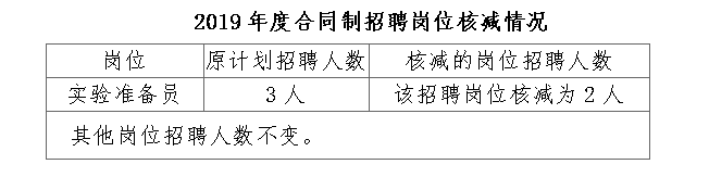 二、根据《星空XK体育2019年度公开招聘合同制工作人员实施方案》规定,实验准备员岗位通过资格审查人数未达到招聘方案要求,核减实验准备员岗位招聘人数,具体情况公布如下: