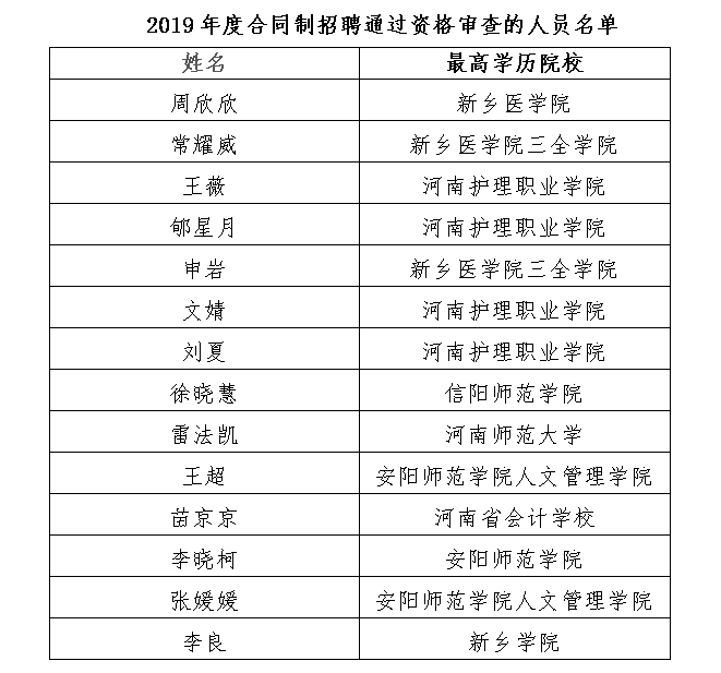 一、根据《星空XK体育2019年度公开招聘合同制工作人员实施方案》规定,现将通过资格审查的人员名单予以公示。公示期为:2020年3月30日-2020年4月8日。有异议者,请于2020年4月8日17点前以书面形式报人事处,电话0372—5365803,18637281960。监督电话:星空XK体育纪检监察室0372-5365958。(工作时间)