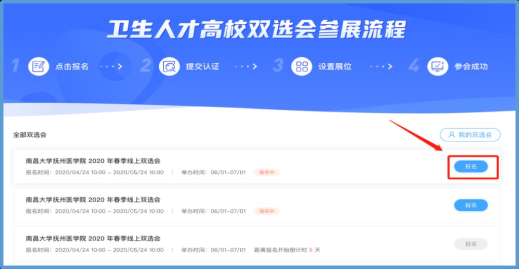 3.点击高校招聘会报名入口,选择需要报名的高校招聘会场次进行报名(新注册用户自动进入招聘会报名页面)