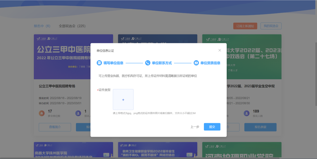 3.点击企业管理后台左侧“高校双选会”,选择需要报名的高校招聘会场次进行报名(新注册用户自动进入招聘会报名页面)