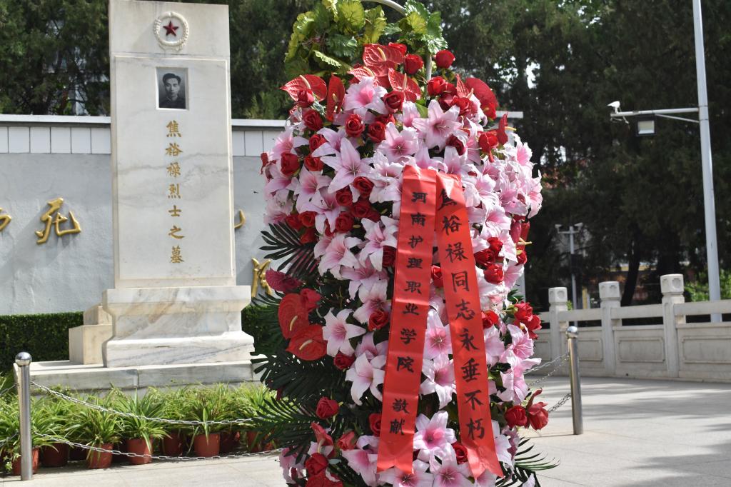 焦裕禄纪念园内,在苍松翠柏的掩映下,焦裕禄纪念园格外庄严肃穆。在烈士墓前,郭茂华院长代表学院向焦裕禄烈士陵墓敬献花篮,全体人员怀着无比崇敬的心情,向焦裕禄烈士陵墓三鞠躬,并绕陵墓一周瞻仰焦裕禄烈士墓。